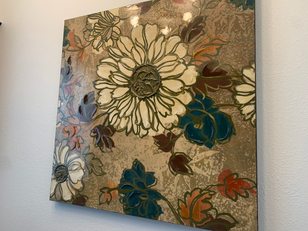The large giclée was $5 at a garage sale, likely a $100 piece, if not more. Art in a laundry room makes it feel more pleasant and homey, and buying art pieces at a garage sale or thrift store is smart! I often take these pieces to my listings for staging, so since they are constantly being moved and potentially at risk of being damaged, I never pay full price. And they add drama and color wherever they go.