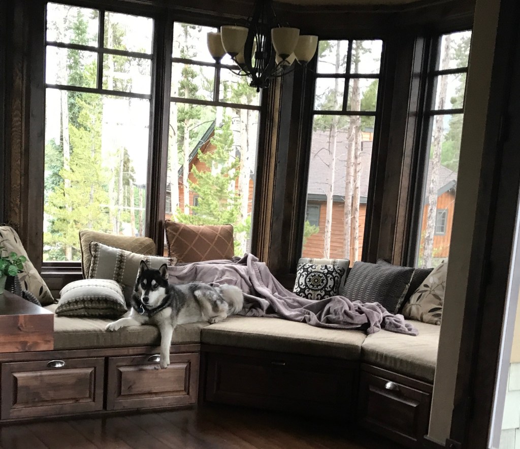 This was a bay window in an unusual configuration at our vacation home. It was set into the corner of the house, so it had a 180 degree or larger view of the mountains. I added a custom window seat with storage and a 4 inch padding. This became a favorite nap spot for humans and dogs alike! And the center piece converted to a game table! and extra seating, so it wasn’t unusual to find our family playing Monopoly in this space.